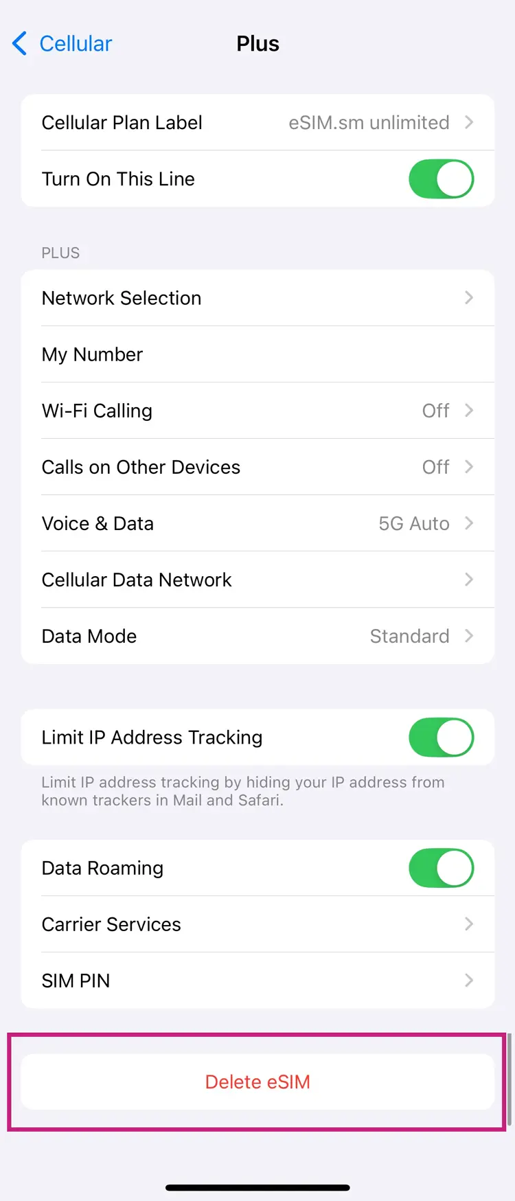 Scroll to the bottom of the section to find the “Delete eSIM” option