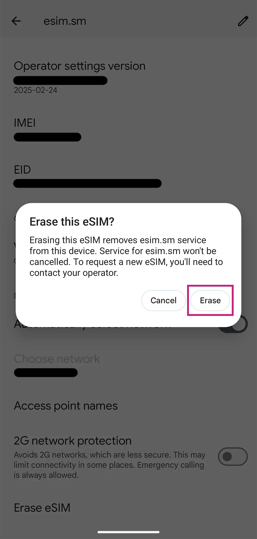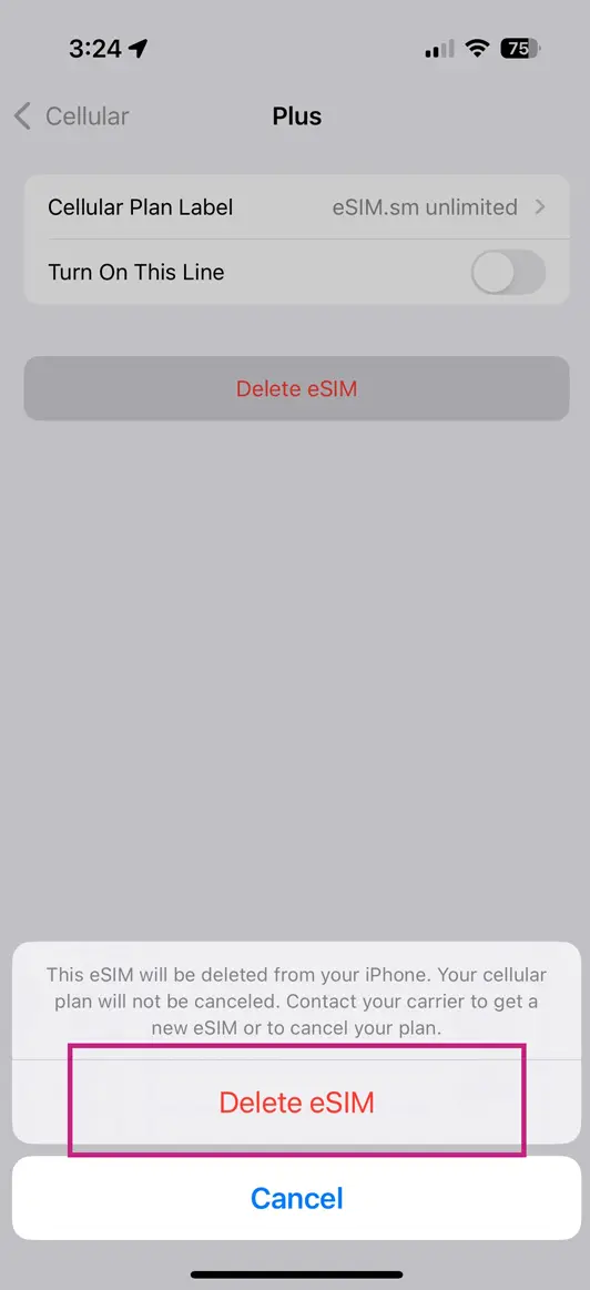 You will need to confirm the decision to delete the eSIM twice. Remember that once deleted, you will no longer be able to use or reinstall it.