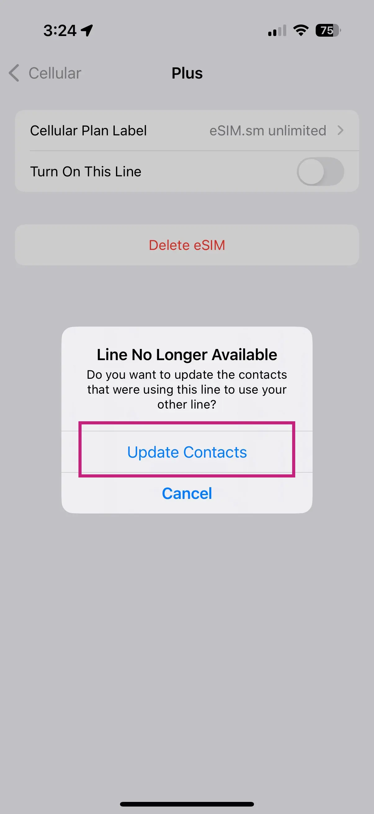 Click on “Update Contacts” to completely remove the eSIM records from your smartphone.