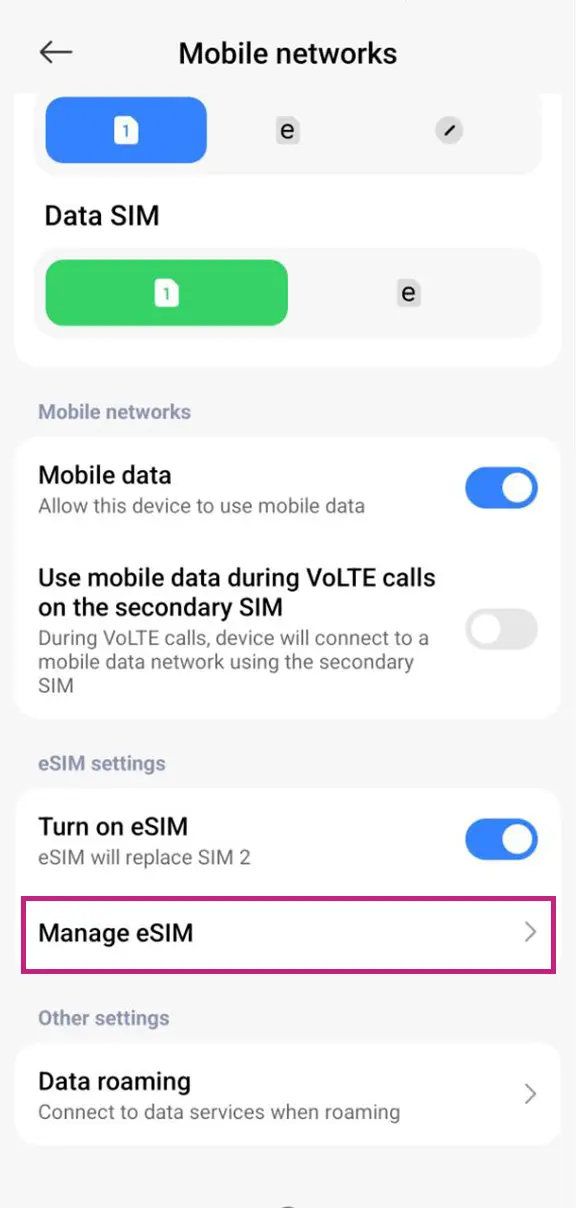If the eSIM is still ENABLED, Go to Settings > Mobile Service/ Cellular > SIMs and select the eSIM you want to delete.