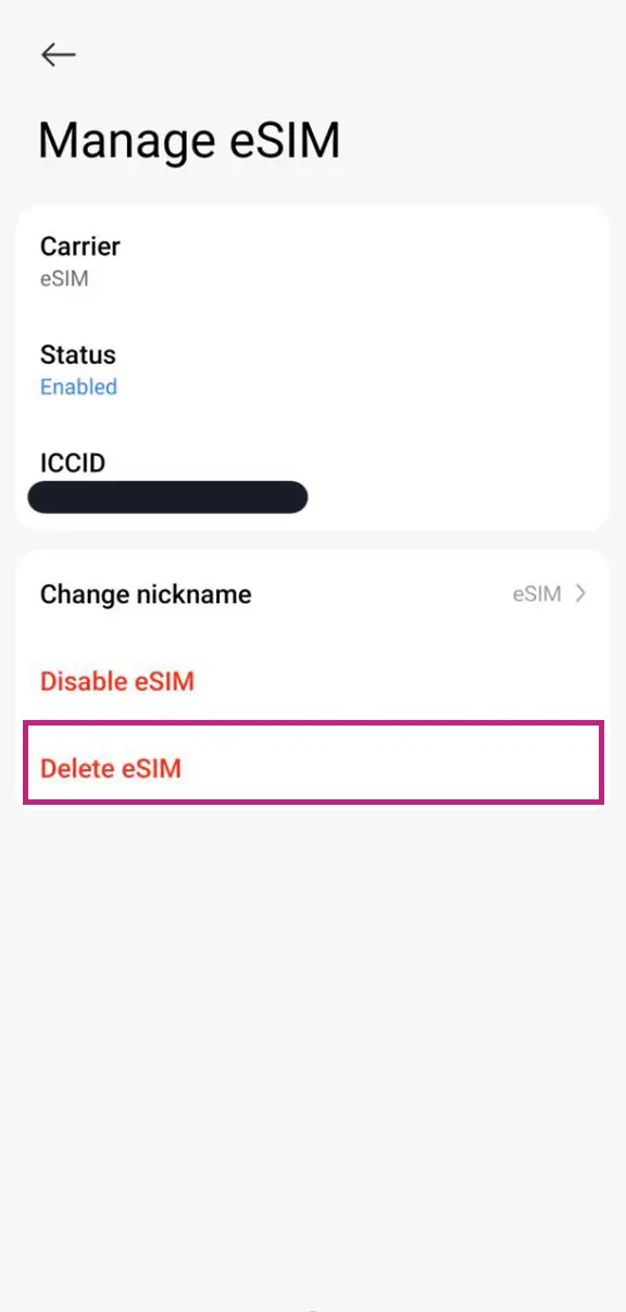 Warning: once deleted, the same eSIM cannot be reinstalled. Only proceed if the eSIM is expired.